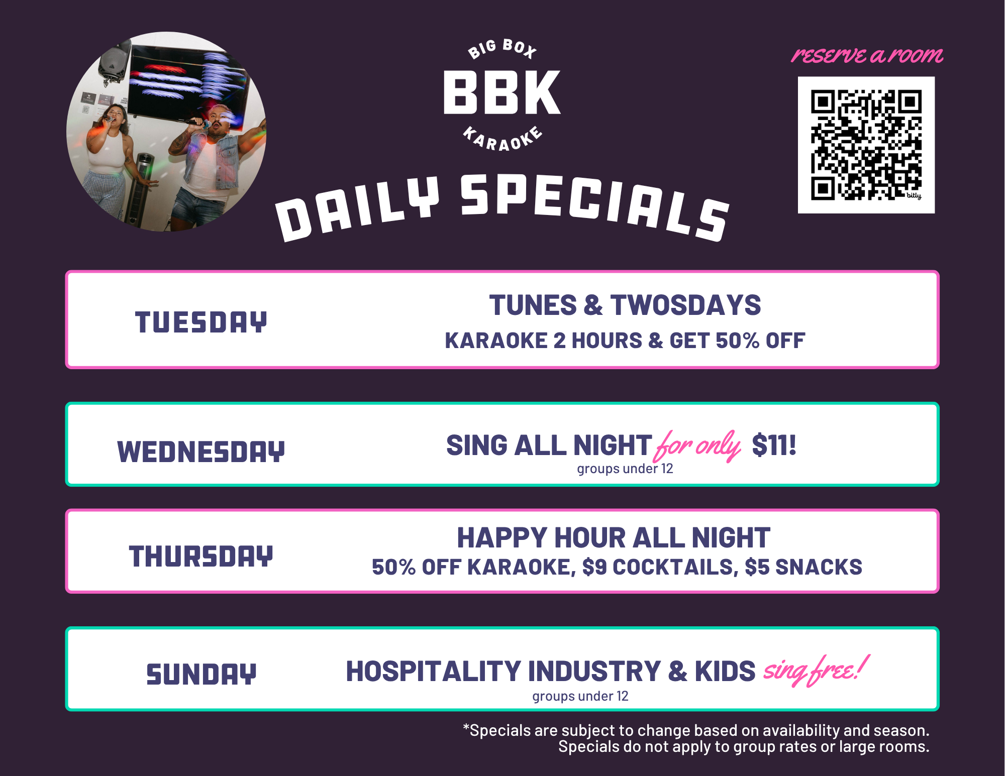 It’s a pretty special thing to karaoke in a private room with the people you love most, but it’s even more special with some fun weekly deals! Save the date to take advantage of these specials and attend one of our fun upcoming events!